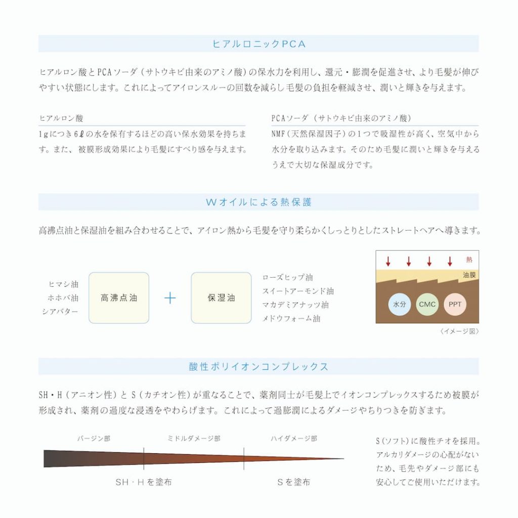 縮毛矯正における水分の大切さに着目し、ヒアルロン酸を配合することで水分保持力を高め、熱処理後でもみずみずしく潤った仕上がりを実現しました。また、薬剤同士でコンプレックスをおこし、トリートメントをしたようなストレートヘアへ。