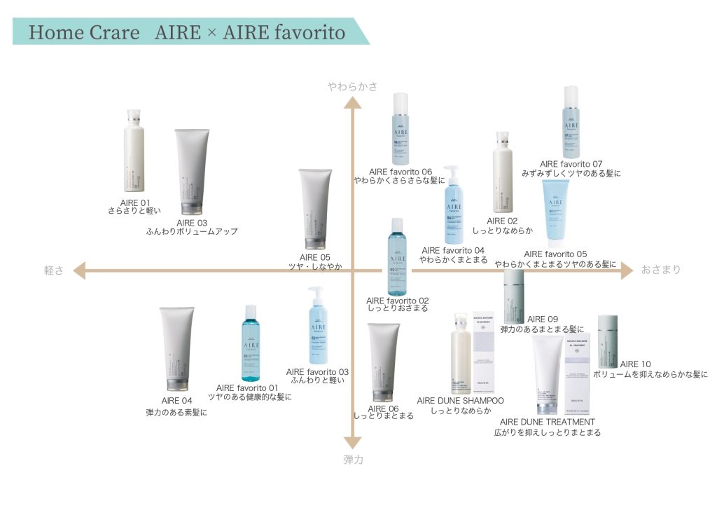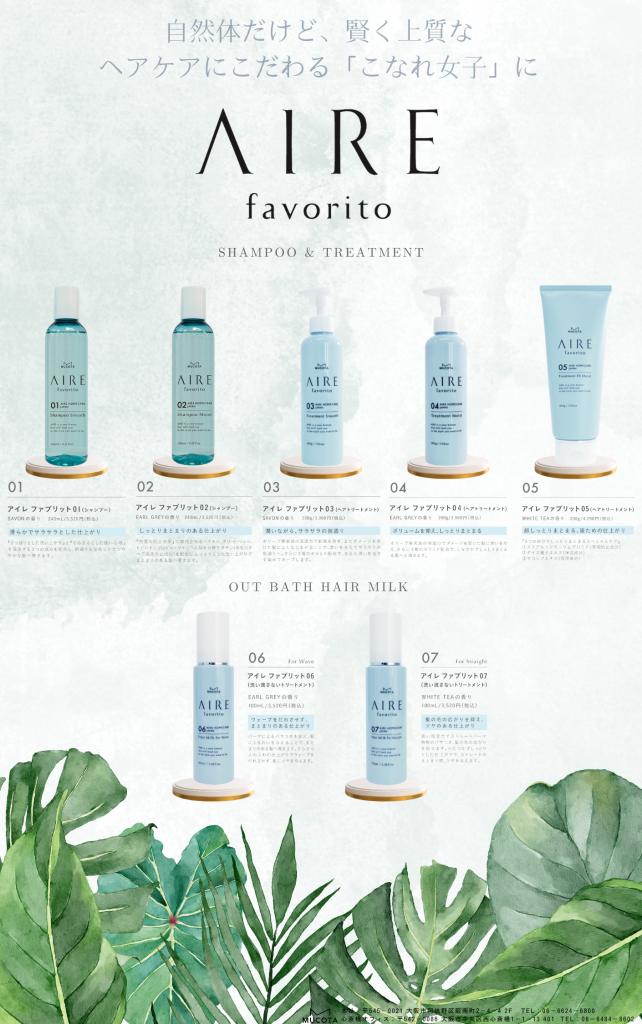 【AIRE favorito】は加齢による髪のうねりなどの悩みを「ラクトン」「加水分解コメタンパク」で、繰り返しのカラーケアを「ヘマチン」で、お肌と同様、頭皮にもつ必要な保湿と弾力を「ダイズ種子エキス」「マコンブエキス」さらに「ステアルトリモニウムブロミド」のトリプル成分で、しっかりとケアをしていきます。