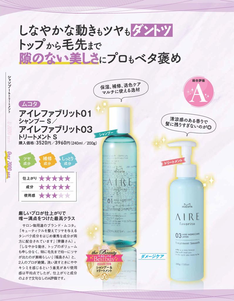 2024年2月発売のサロン専売品ホームケアシリーズ【AIRE favorito】から『アイレファブリット 01シャンプー S』と『アイレファブリット 03トリートメント S』が、「LDK the beauy」2024年7月号・シャンプー&トリートメント100製品ABC判定にてA評価・ベストバイコスメを獲得しました。